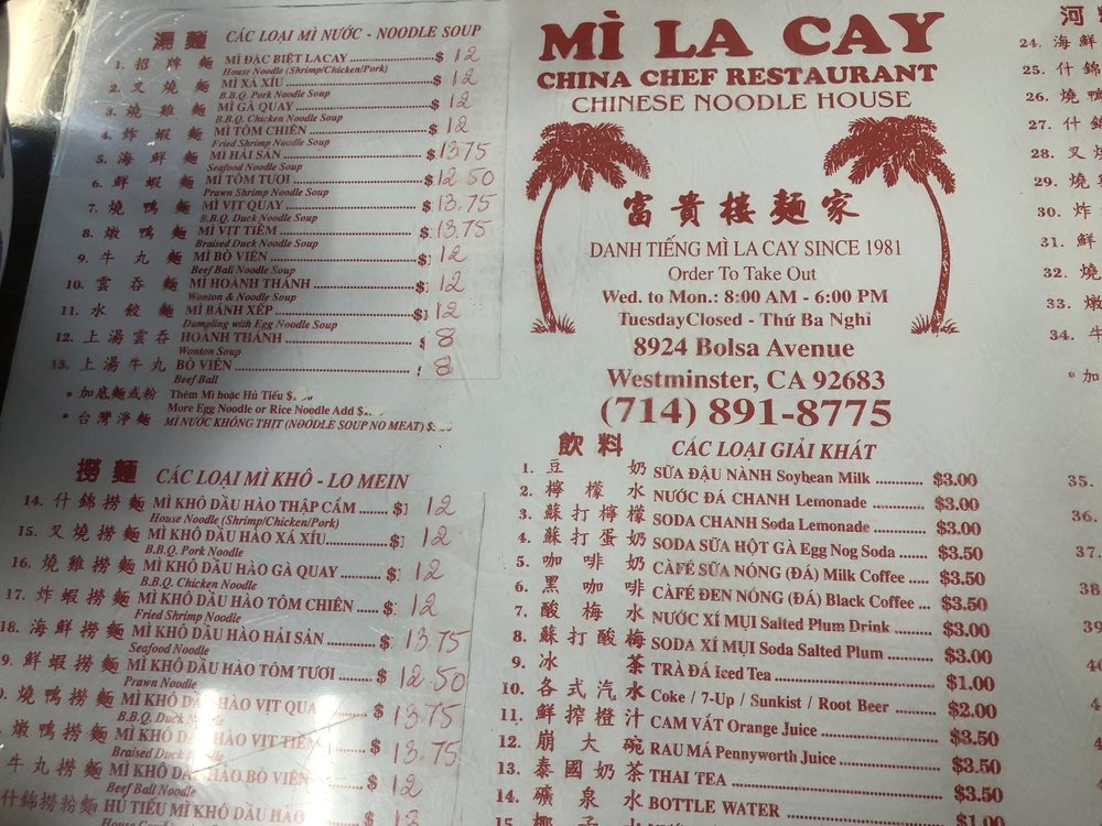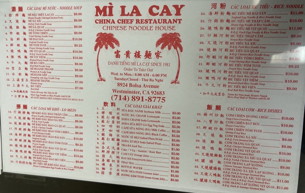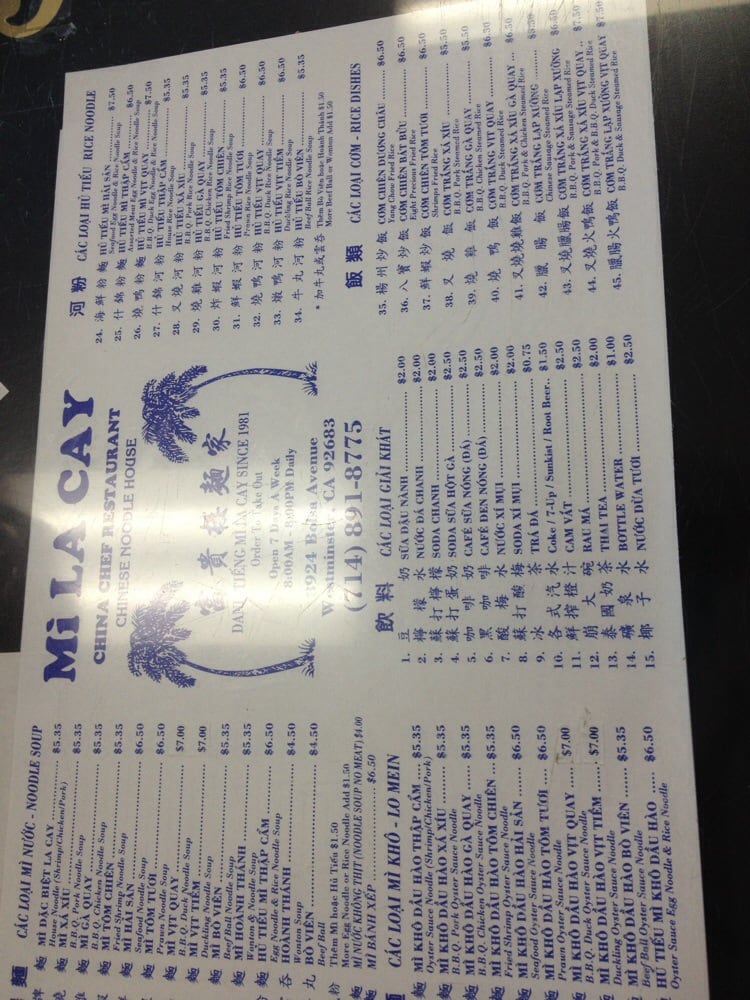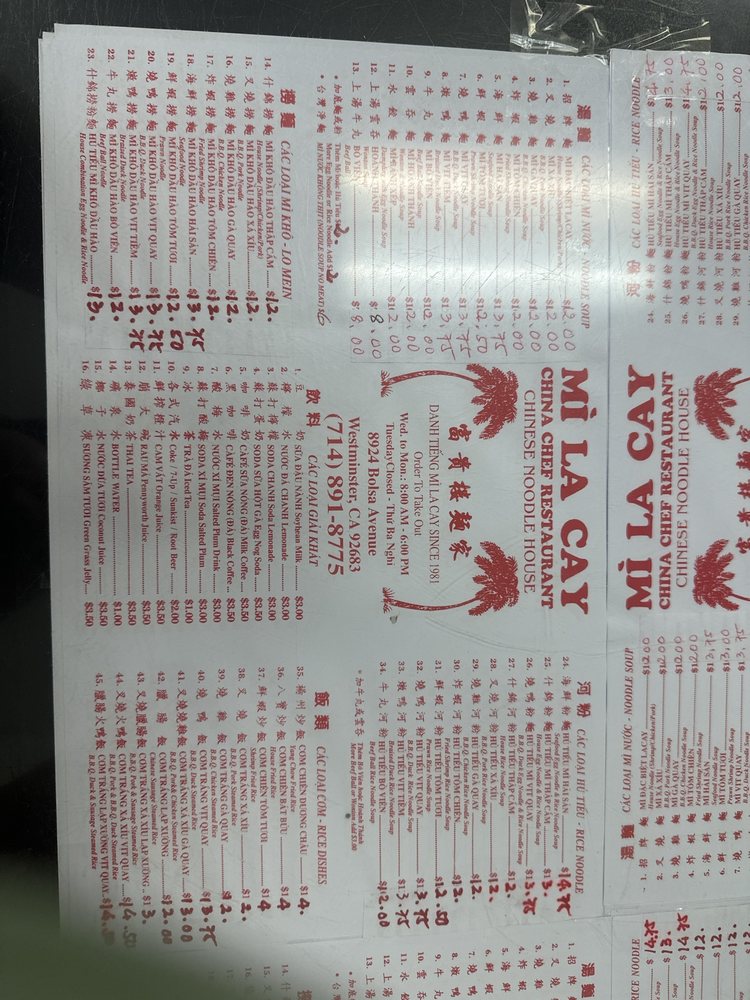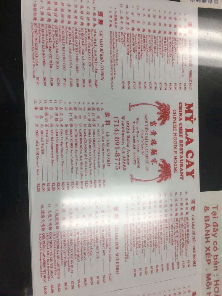 Mi La Cay is a casual Asian restaurant located in Westminster, CA, offering a variety of noodle soups and rice noodle dishes. The menu includes options such as BBQ pork noodle soup, fried shrimp noodle soup, and seafood noodle soup. Customers praise the authentic flavors and generous portions of protein in their dishes. The simple decor and fast service create a no-frills dining experience that focuses on the delicious food. Regulars appreciate the consistency of the meals and the affordable prices. Mi La Cay is a go-to spot for Chinese-style egg noodle soup in Orange County, with many loyal customers returning for decades.