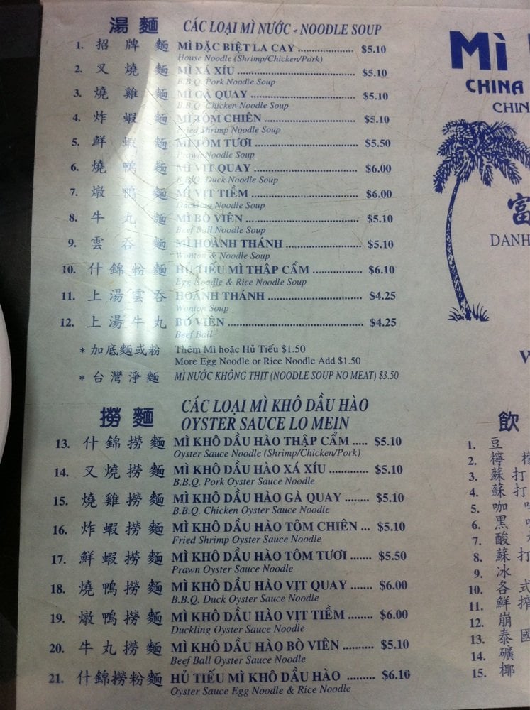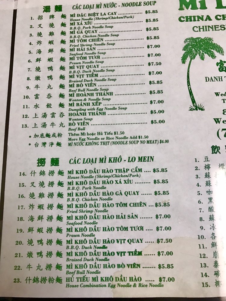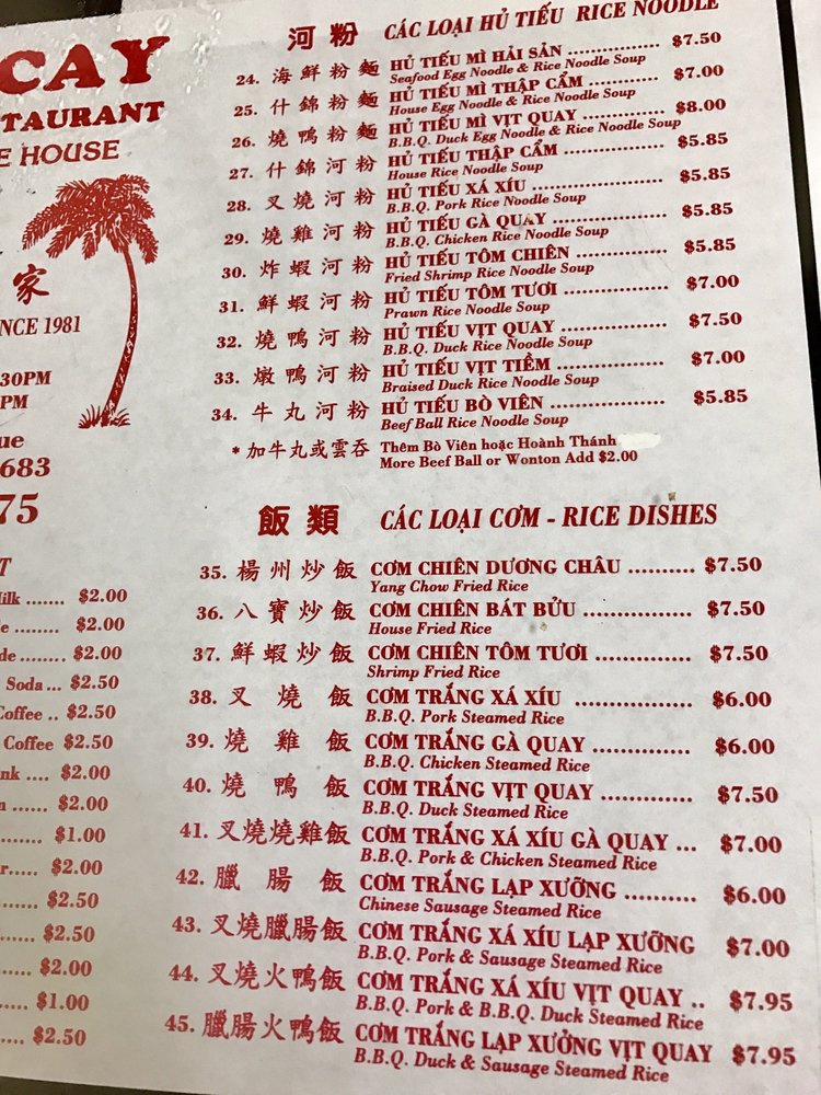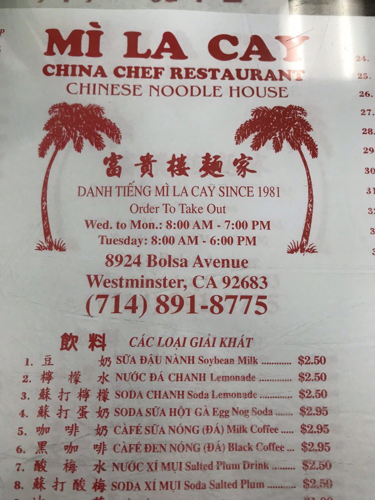 Mi La Cay is a casual Asian restaurant located in Westminster, CA, offering a variety of noodle soups and rice noodle dishes. The menu includes options such as BBQ pork noodle soup, fried shrimp noodle soup, and seafood noodle soup. Customers praise the authentic flavors and generous portions of protein in their dishes. The simple decor and fast service create a no-frills dining experience that focuses on the delicious food. Regulars appreciate the consistency of the meals and the affordable prices. Mi La Cay is a go-to spot for Chinese-style egg noodle soup in Orange County, with many loyal customers returning for decades.